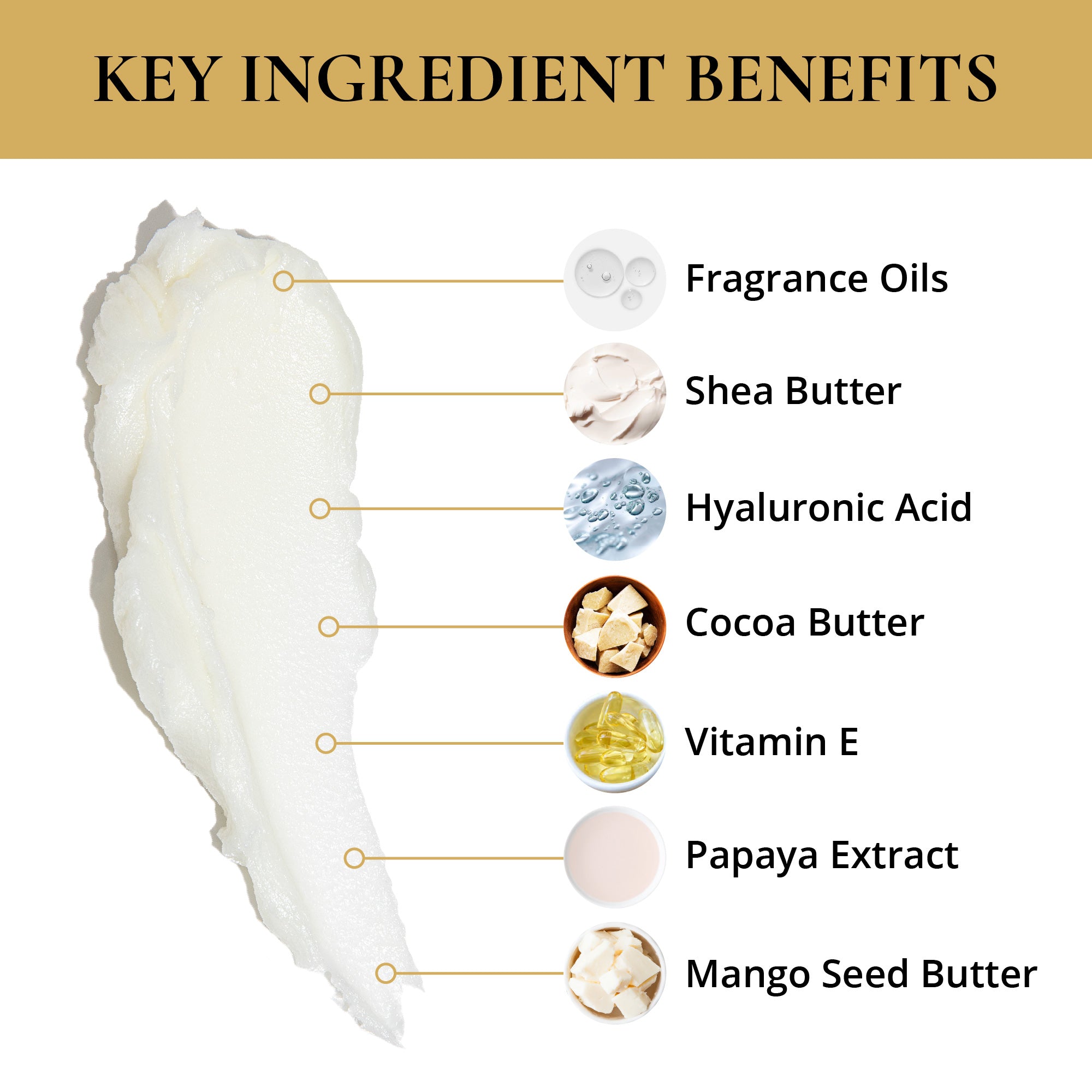 Enjoy a natural glow with our special formulation featuring Hyaluronic Acid, Vitamin E, Shea, Cocoa and Mango Butters, leaving your skin soft, velvety, and non-greasy all day long. Deeply hydrating, this unisex rich butter nourishes from head to toe.